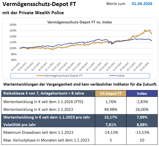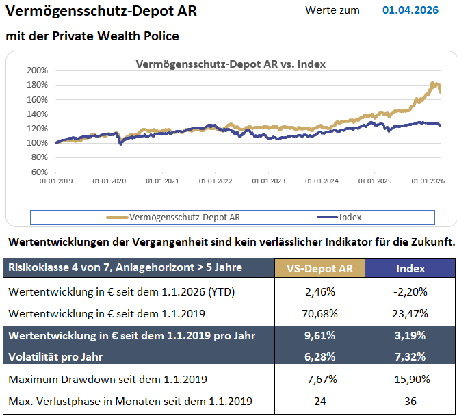 Vermögensschutz-Depot AR – steht für die defensivere Variante und Vermögensschutz-Depot FT für ein höheres Rendite-Potenzial.